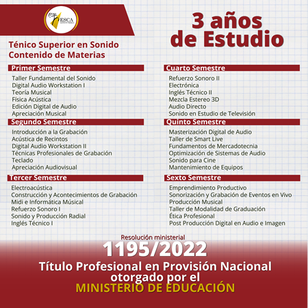 El Técnico Superior en Sonido está capacitado para desempeñarse en las diferentes áreas referidas a la tecnología del sonido; con el conocimiento y práctica suficientes que le permitan cumplir con funciones propias en sistemas de audio, estudios de grabación, radio, cine, multimedia y televisión; además de contar con la base suficiente para adaptarse a las nuevas necesidades del mercado y la tecnología. .